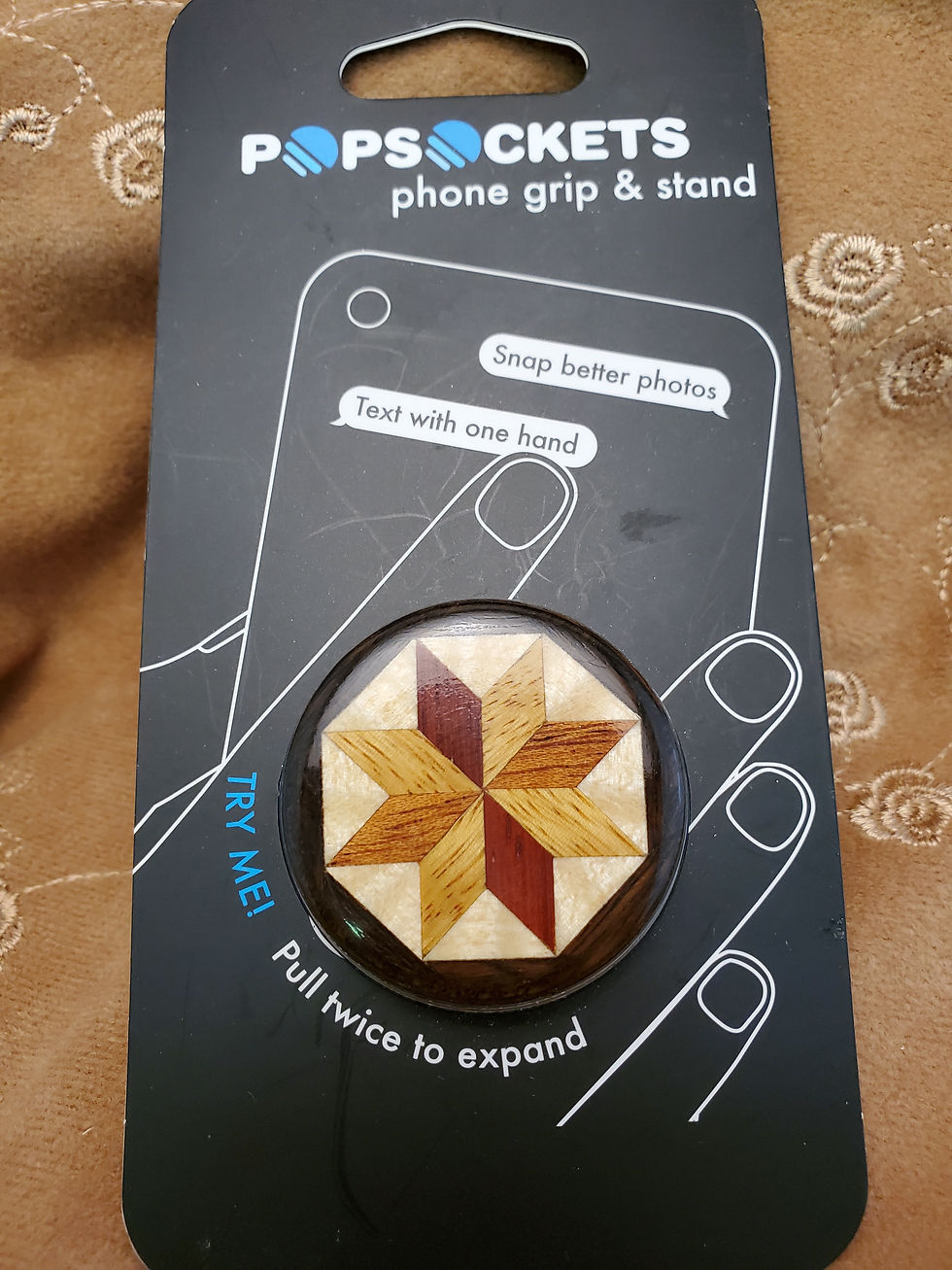 Wood Quilt Blocks are handcrafted by Thomas Hannon. The items are based on traditional quilt patterns. The designs use a variety of species of natural wood veneers, each piece individually cut by hand with a knife and a straight-edge, glued in place, and finished. The needle minders and ornaments are finished with hand rubbed polyurethane. The earrings, pendants, pill boxes and popsockets are coated with an acrylic layer for a tough durable finish.